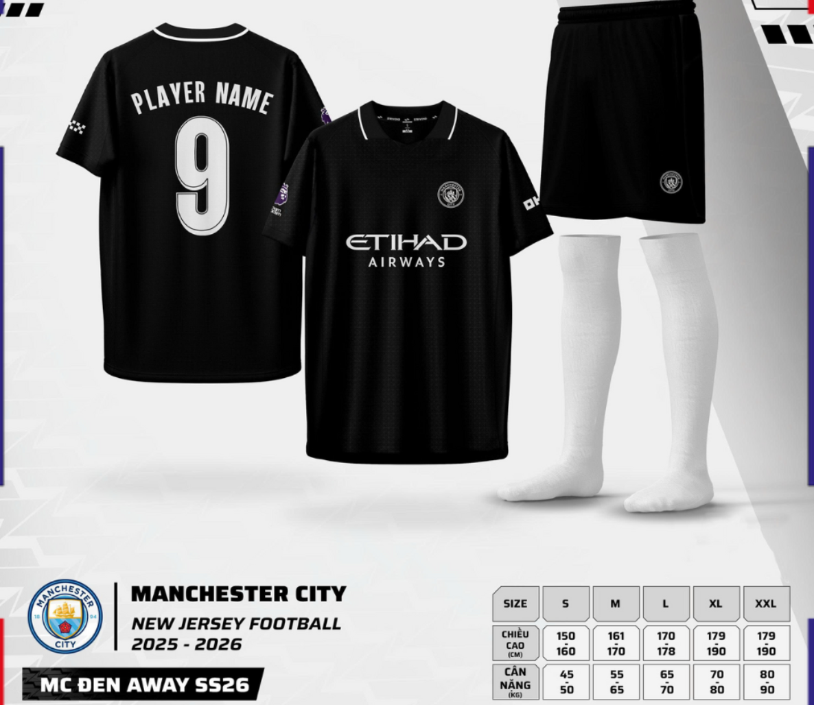 Mẫu áo bóng đá Manchester City màu đen 2025–2026 mang đến diện mạo mới lạ, mạnh mẽ và rất “ngầu” trên sân. Thiết kế tông đen chủ đạo giúp tổng thể trông cá tính, hiện đại, phù hợp cho fan MC cũng như anh em chơi bóng thích phong cách tối giản nhưng nổi bật.